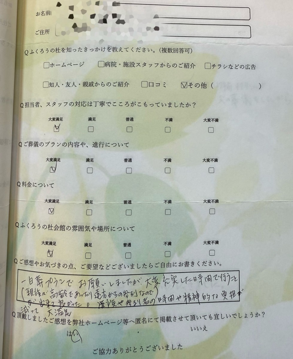ふくろうの杜をご利用のお客様より、嬉しいお声をいただきましたのでご紹介いたします。