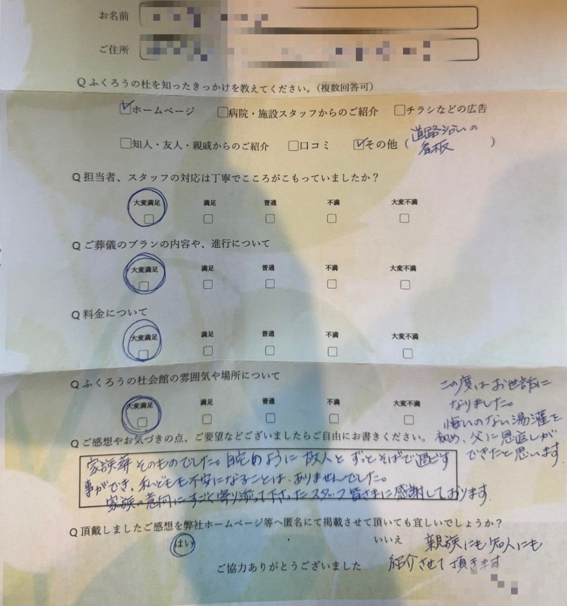 ふくろうの杜をご利用のお客様より、嬉しいお声をいただきましたのでご紹介いたします。